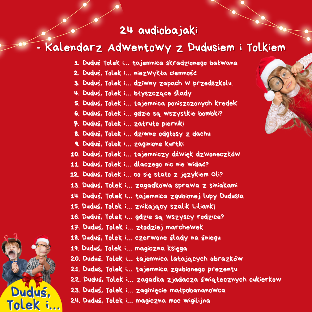 Zeszłoroczna edycja Kalendarza Adwentowego 2023 z Dudusiem i Tolkiem była absolutnym hitem wśród dzieci. 24 historie na każdy dzień Adwentu, odkrywane dzień po dniu, jak okienka z czekoladkami sprawiły, że oczekiwanie na Święta przyniosło małym detektywom jeszcze więcej radości!